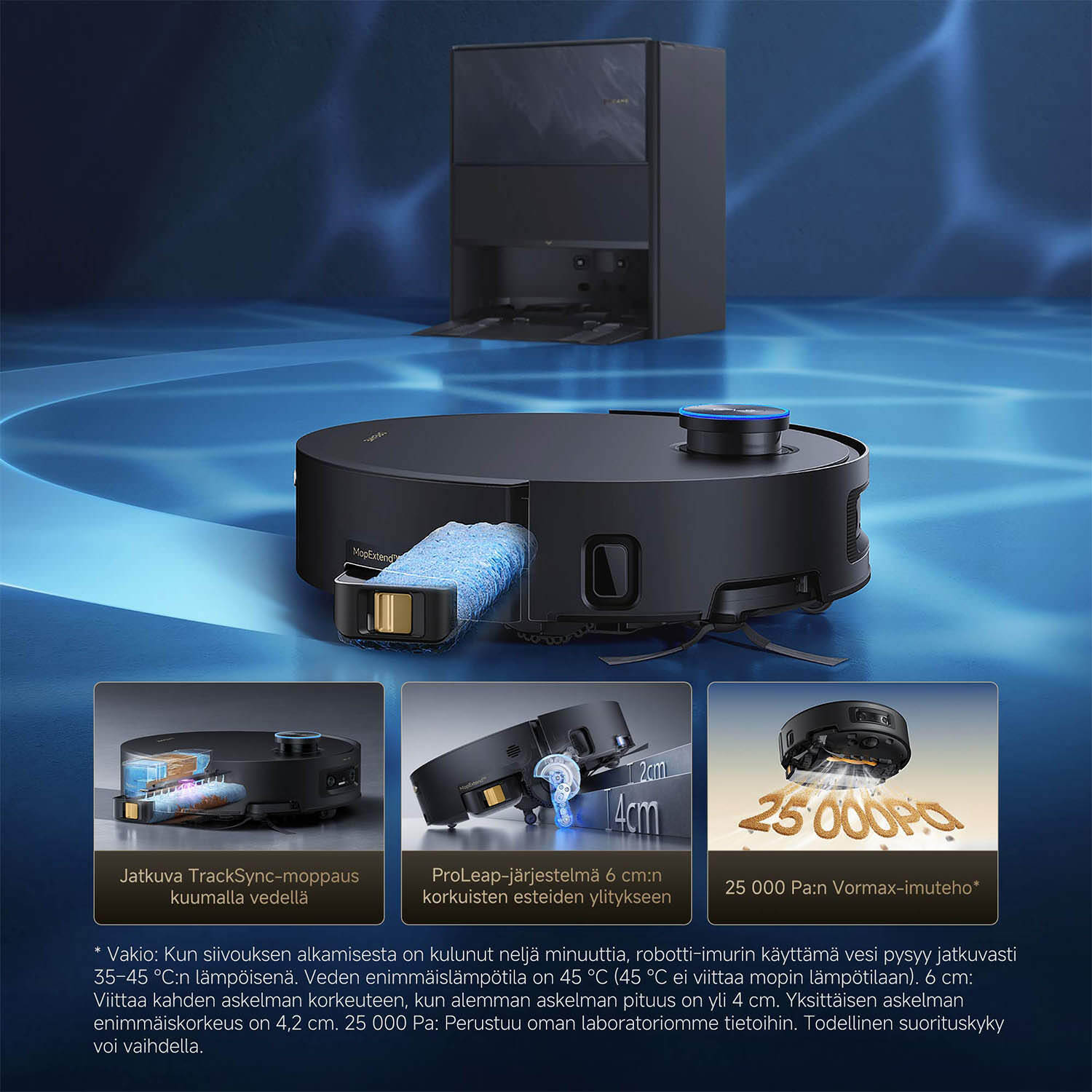 Itsepuhdistuvalla kuumavesimopilla moppaava robotti-imuri 25 000 Pa imuteholla! Tuplaharja ja autonominen tyhjennys/puhdistusasema.