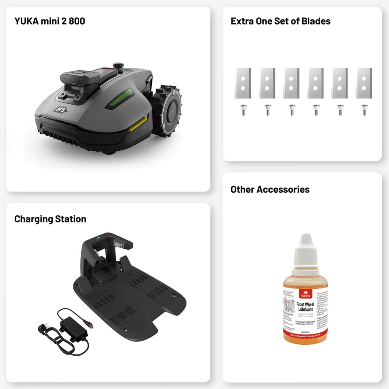 YUKA mini 2 800 maksimi leikkuualue on 800 m². Leikkurin leikkuuleveys on 190 mm ja leikkuukorkeus säädettävissä välille 20-60 mm. Leikkuri on varustettu 4.5 Ah akulla ja sen toiminta-aika yhdellä latauksella on noin 120 min. Leikkuri siirtyy lataukseen automaattisesti. Etäkäyttöä varten laitteessa on Bluetooth, WiFi ja 4G-yhteydet.